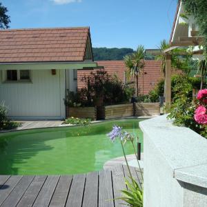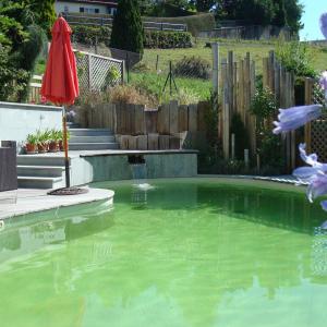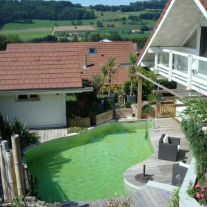 Photo de la piscine ntaurelle réalisée pour des clients particuliers près d'Annemasse. Au centre, on voit un enfant sur une bouée. On voit nettement que l'eau est propre. Tout autour de la piscine naturelle, on voit l'aménagement du jardin